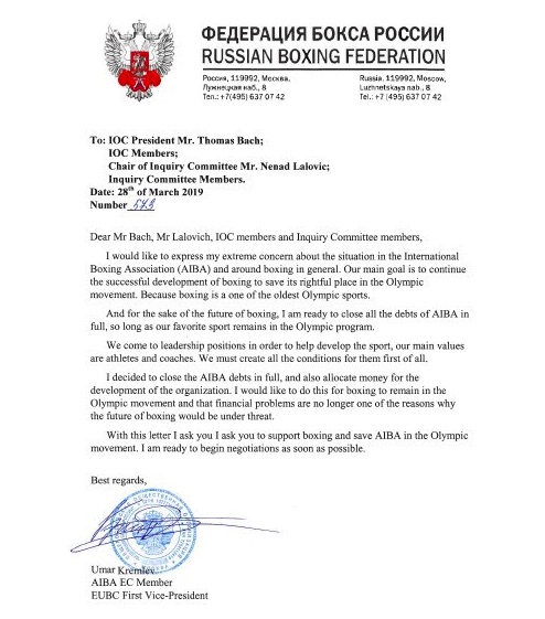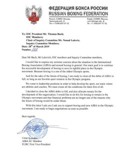 Per accelerare i tempi è intervenuto Umar Kremlev (foto sopra), che si è candidato alla presidenza con una dichiarazione all’agenzia Tass (il Congresso elettivo dovrebbe essere convocato entro metà dicembre 2019). Il russo è uscito allo scoperto: in una lettera (foto sotto) inviata a Thomas Bach, presidente del CIO (e pubblicata dal sito insidethegames.biz), ha annunciato l’intenzione di coprire con le sue finanze personali i debiti AIBA per l’intero ammontare dei 16 milioni di dollari. Nella stessa lettera dice di essersi convinto a offrire il suo contributo per il bene del pugilato, sperando che l’azzeramento dei problemi economici conservi la presenza di questo sport all’interno dei Giochi. Kremlev chiude la missiva invitando Bach a tutelare la figura dell’AIBA all’interno del movimento olimpico.