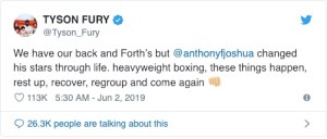 Il britannico ha più o meno scritto così sul suo account Twitter: “È normale. Abbiamo alti e bassi, hai già dimostrato di saper cambiare molte cose nella tua vita. Tra i pesi massimi succede. Riposati, recupera e torna a provarci ancora”.