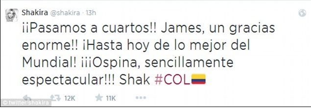 Shakira scrive un tweet al suo compagno Gerard Piqué: “Passiamo ai quarti!! James, un grazie enorme! Sei il migliore del mondo. Semplicemente spettacolare”.