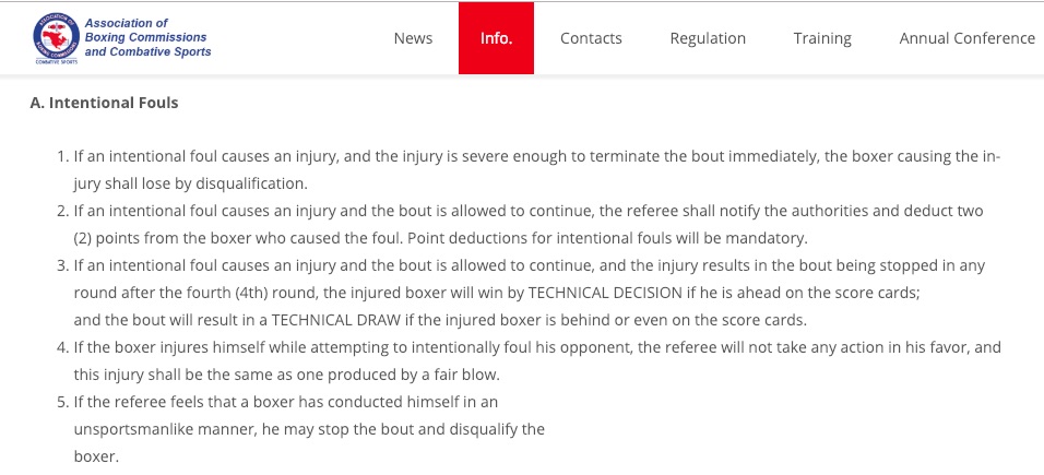L’Associazione al capitolo A Intentionale Fouls, comma 5 scrive: “Se l’arbitro intuisce che un pugile si è comportato in modo antisportivo, può fermare l’incontro e squalificare il pugile”.