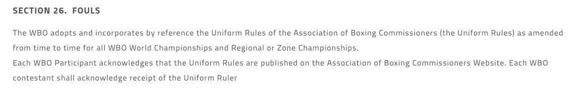 Il regolamento della World Boxing Organization, nella sezione 26 Falli, fa riferimento alle Uniform Rules of the Association of Boxing Commissioners.
