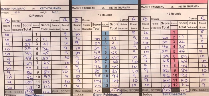Alla fine i giudici hanno espresso un verdetto di split decision, due cartellini per il filippino (115-112 per entrambi), uno per lo statunitense (114-113). Io avevo due punti per Pacquiao, supercampione mondiale dei welter targati WBA.