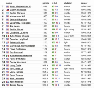 La classifica pound for pound (una graduatoria che prescinde dalla categoria di peso in cui il pugile si è battuto in carriera) è la più difficile da compilare ed è anche la meno attendibile. Quella all time poi (cioè la graduatoria che mette in fila pugili di ogni epoca) è un misto di miraggi, sogni e competenze. Ogni compilatore usa criteri personali, più o meno simili ma pesantemente soggettivi.