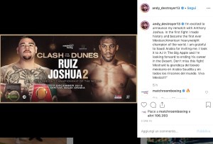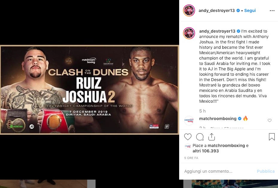 L’annuncio è arrivato via social network, sembra sia l’unico modo per comunicare. Andy Ruiz jr l’ha postato sul suo profilo Instagram. E dopo cinque ore quelle poche righe erano già state lette da 106.393 persone.