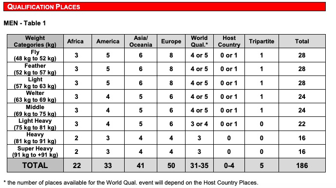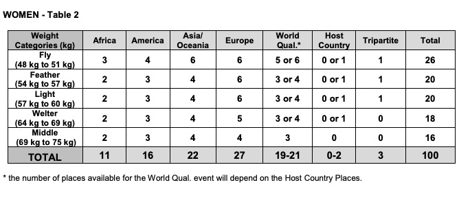 A Tokyo 2020 gli uomini saranno 186 (passando da 10 a 8 categorie di peso) e le donne 100 (salendo da tre a cinque categorie).