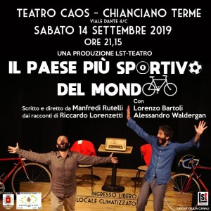 Stasera al Teatro Caos di Chianciano Terme, dalle 21:15 sarà rappresentato per la prima volta “Il Paese più sportivo del Mondo”, racconto a due voci con Lorenzo Bartoli e Alessandro Waldegram, tratto dall’omonimo libro di racconti scritto da Riccardo Lorenzetti. Regia di Manfredi Rutelli.