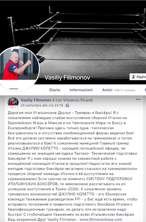 “Miei cari amici italiani, allenatori e pugili.Mi è dispiaciuto vedere la scialba prestazione della squadra italiana ai Giochi europei di Minsk e ai Mondiali di Ekaterinburg!