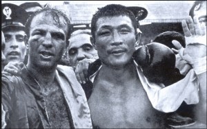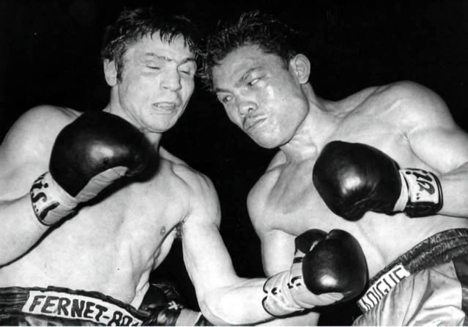 La faccia di Mazzinghi è una maschera di sofferenza. I capelli, non più folti e ricci ma radi e lisci, sono appiccicati alla fronte dal sudore. Gli occhi sono gonfi, un taglio profondo e sanguinante segna brutalmente lo zigomo destro. È il volto di un eroe appena tornato dalla battaglia. Una lotta antica che solo guerrieri senza paura possono combattere. Anche l’altro porta i segni dello scontro. Ha l’occhio destro chiuso, gli zigomi gonfi e un taglio sulle labbra. Una foto meravigliosa cattura l’immagine dei due gladiatori. Pesti, stanchi, sanguinanti e distrutti dalla fatica e dai colpi subiti. Ma vicini. Testa contro testa, guardano la macchinetta fotografica. Le mani vanno ad accarezzare il volto di quello che fino a poco prima è stato un nemico da distruggere e ora è solo un compagno di viaggio lungo la difficile strada della boxe. Di combattimenti così puoi permettertene solo uno nella vita.