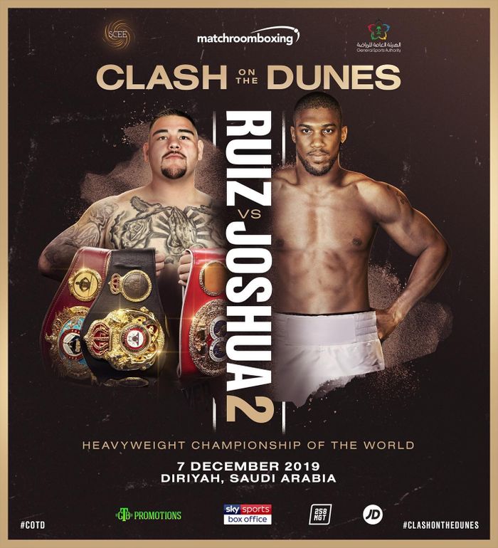Andy Ruiz jr (33-1-0, 22 ko) concederà la rivincita ad Anthony Joshua (22-1-0, 21 ko), da lui sconfitto lo scorso 1 giugno al Madison Square Garden per kot 7. Il match si svolgerà alla Diriyah Arena di Diriyah in Arabia Saudita e sarà valido per il titolo Wbo, Ibf, Wba dei pesi massimi.