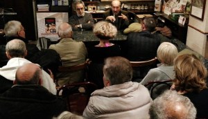 Arrivano i primi tre, poi un secondo gruppetto di cinque, altri due ancora, la porta si apre in continuazione, gente bagnata ma sorridente fa il suo ingresso nella sala. Velocemente il posto si riempie. Alla fine le sedie non bastano più, c’è gente in piedi, pieno anche il corridoio (un angolo del Melograno, foto Viggiani).