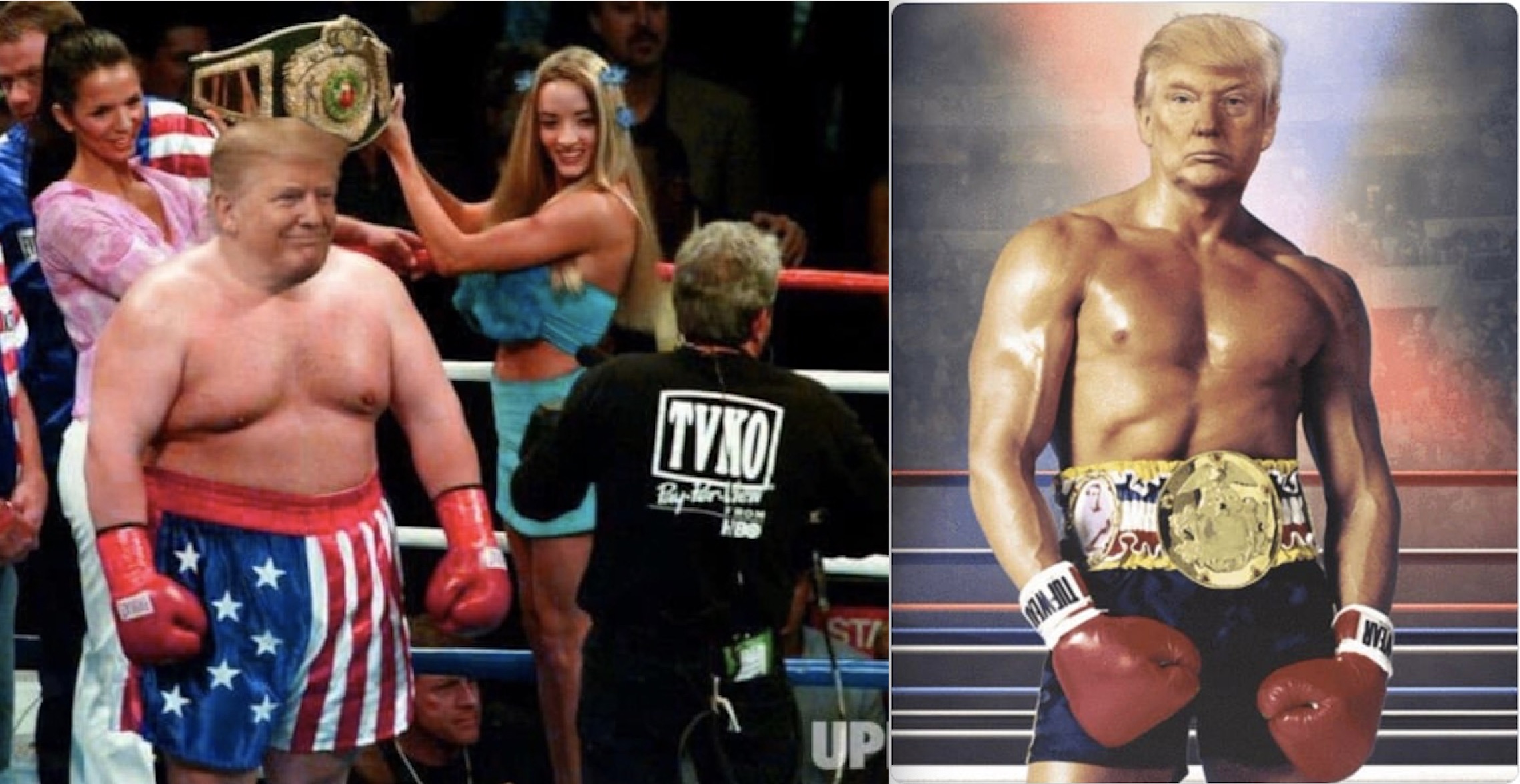A sinistra Trump è nella versione Butterbean, postata da un altro utente Twitter (Photo Twitter/ Paul van Meer). Eric Esch, detto Butterbean (fagiolino) è stato un peso massimo americano, un personaggio soprannominato il re delle quattro riprese, un pugile che ha messo assieme un record di 77-10-4 (58 ko). Uno showman che per qualche anno ha catturato l’attenzione degli spettatori. Nell’ultimo match aveva fermato la bilancia a 190 chili…