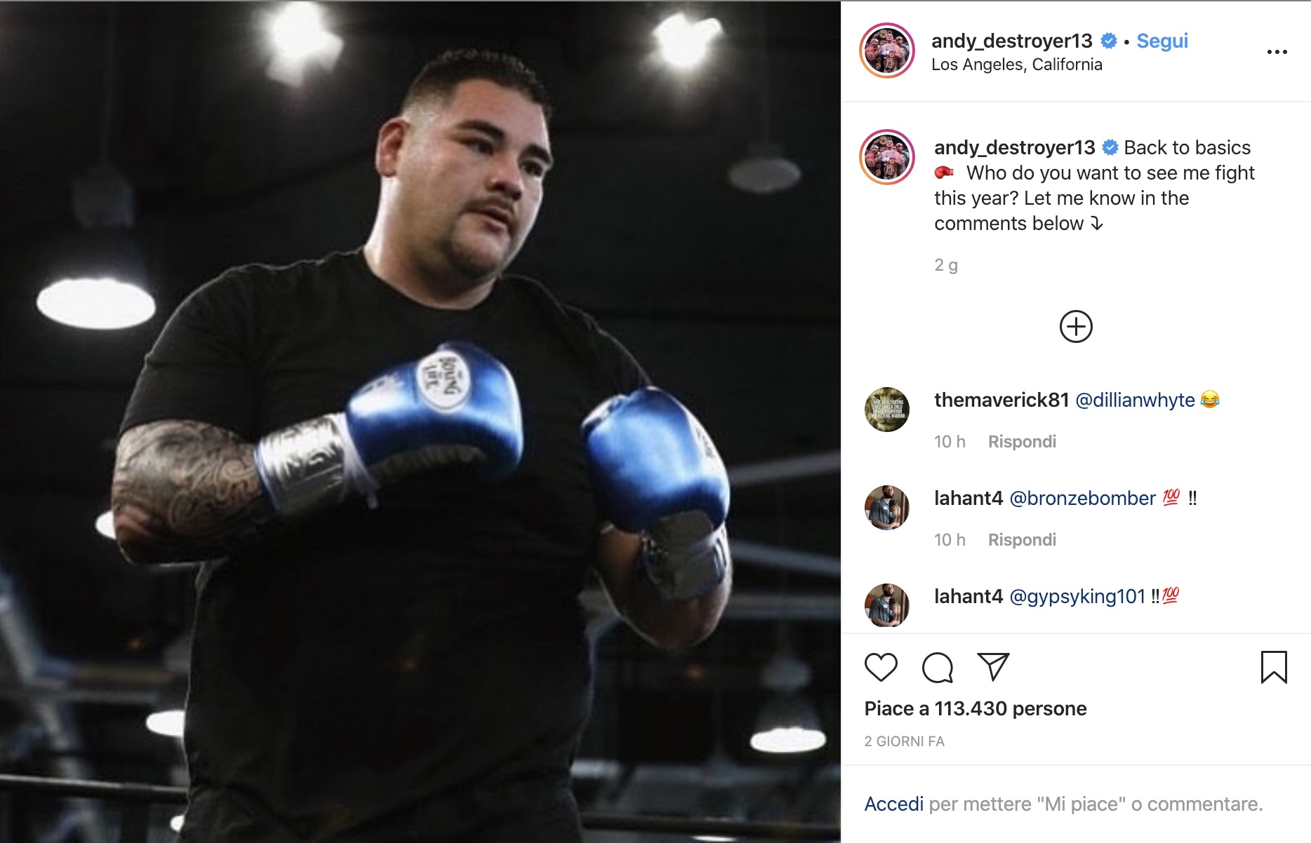 Poi, improvvisamente Andy Ruiz jr torna a farsi sentire. E lo fa come si usa fare oggi, attraverso i social network. Pubblica sul suo profilo Instagram un messaggio per i tifosi: “Chi vorreste che incontrassi quest’anno?“. E loro rispondono senza troppa fantasia: Wilder, Tyson Fury, Whyte, Ortiz…. Alla fine comunque i like sono quasi 130.000. Ma in quanto a fatti concreti, ovviamente, siamo ancora a quota zero.