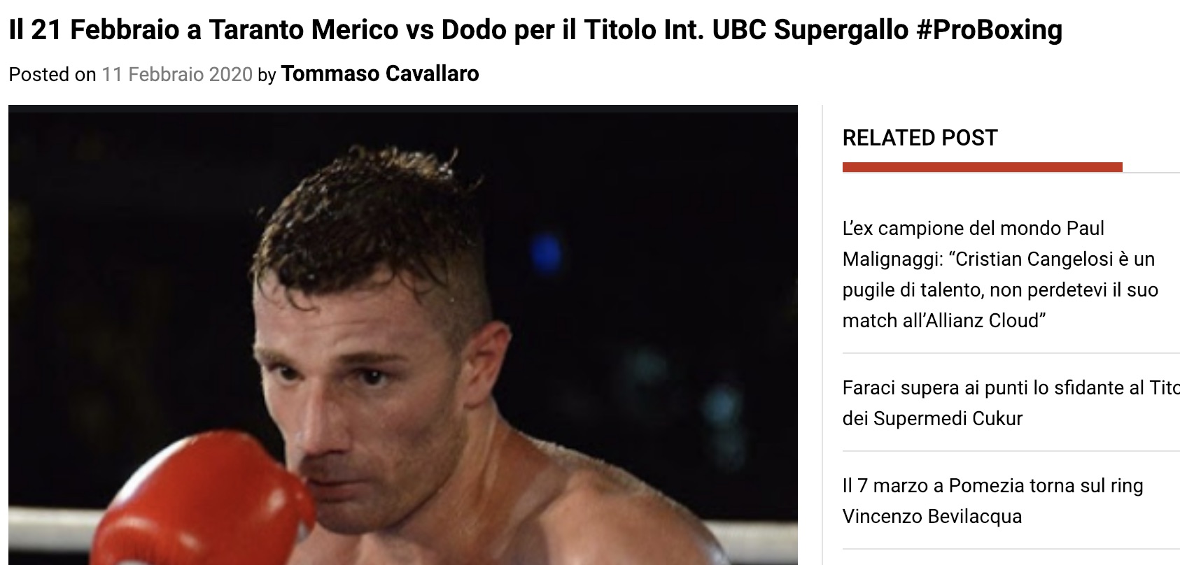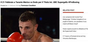 Venerdì 21 febbraio a Taranto, titolo Internazionale UBC dei supergallo tra Luigi Merico (tarantino, 11-0-1, 1ko) e Norbert Dodo (ungherese, 2-1-0, 2 ko). L’avversario del pugliese (che è inattivo da quattordici mesi) ha esordito battendo per ko 2 Richard Voros (6-50-0), ha poi perso contro Lomar Butler (1-0) per ko 1, e ha vinto l’ultimo incontro contro Csiaba Lakatar (0-3-0) per ko 2 nel maggio scorso.