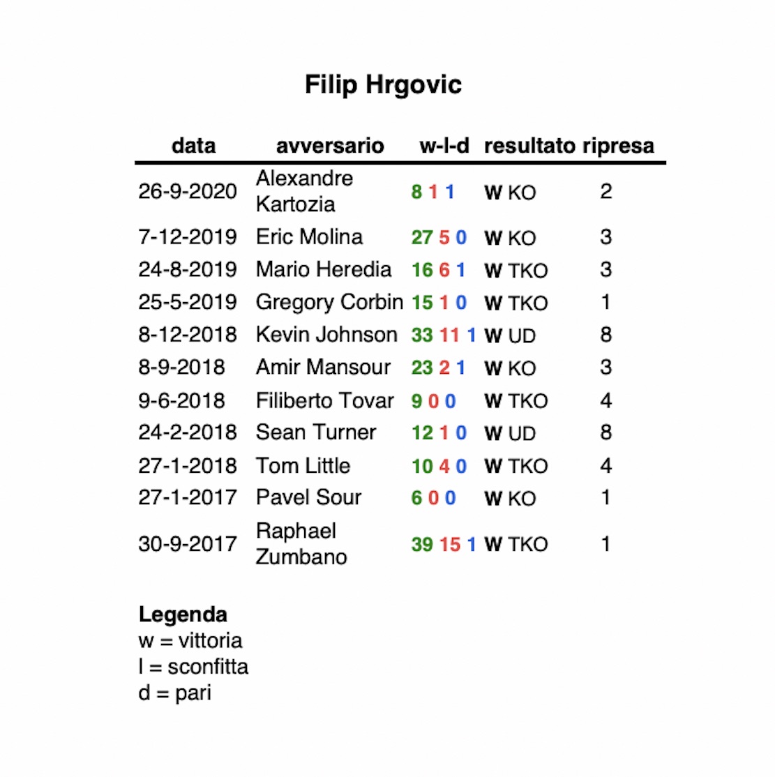 Filip Hrgovic ha 28 anni. Ha esordito il 30 settembre 2017. Oggi ha un record di 11-0 (9 ko). Pesava 112.300, è alto 1.98. Numero 9 Wbc, 6 Ibf, 15 Wbo. Questo il suo record completo.