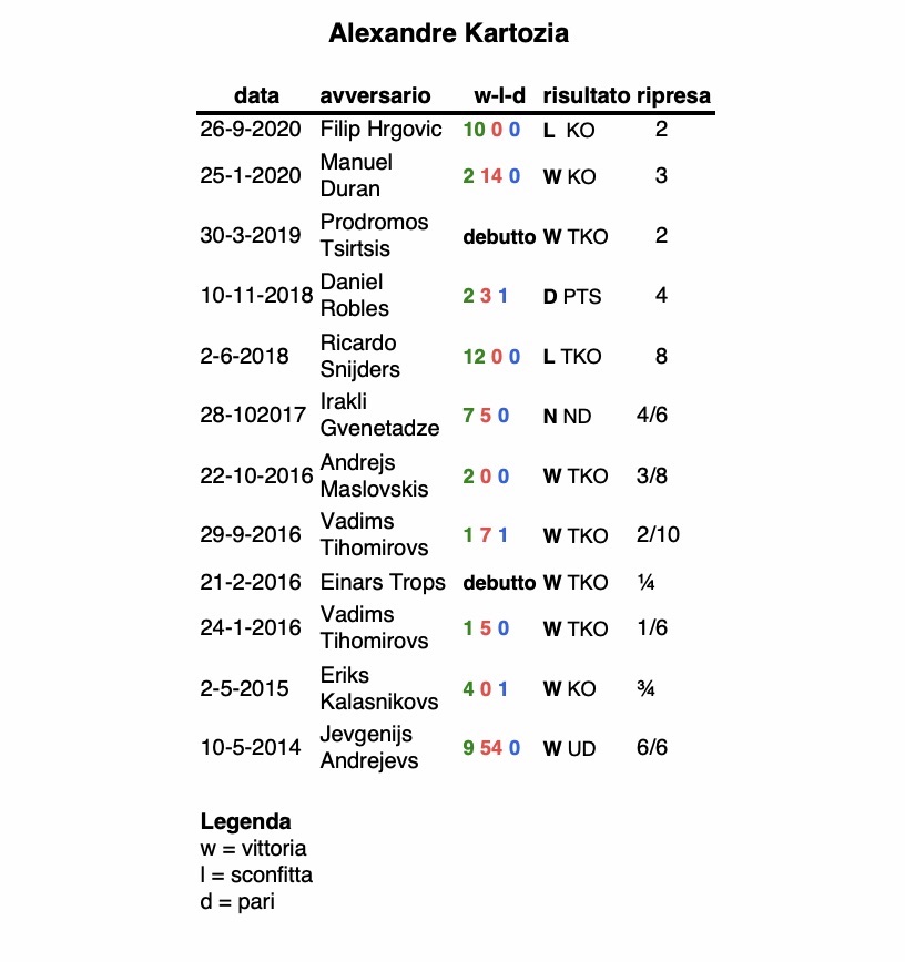 Alexandre Kartozia ha 39 anni. Ha esordito il 10 maggio 2014. Oggi ha un record di 8-2-1 (7 ko). È terzo nella classifica dei pesi massimi greci, che hanno in attività tre pugili nella categoria. Pesava 99,700 kg, è alto 1.88. Questo il suo record completo.