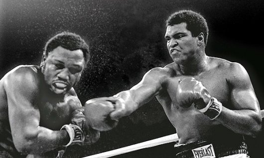 Nella tredicesima ripresa ventisette volte il diretto destro di Ali va a segno, quei colpi dritti trasformano il volto di Frazier in una tragica maschera. Ha gli occhi gonfi e chiusi. Cerca di sentire il rivale, ormai non lo vede più. I colpi che prende sulla faccia servono a fargli capire dove si trova il nemico. Chiede al dolore di indicargli la strada da percorrere, è l’ultima speranza per vincere.