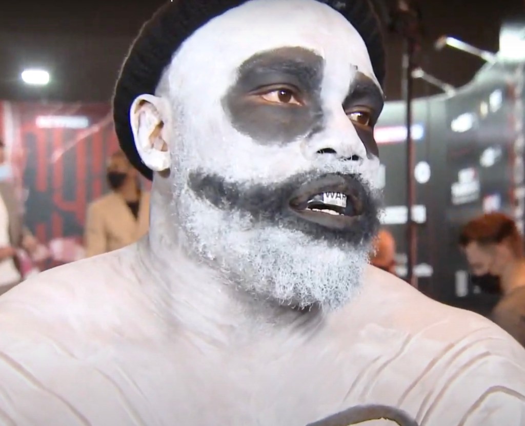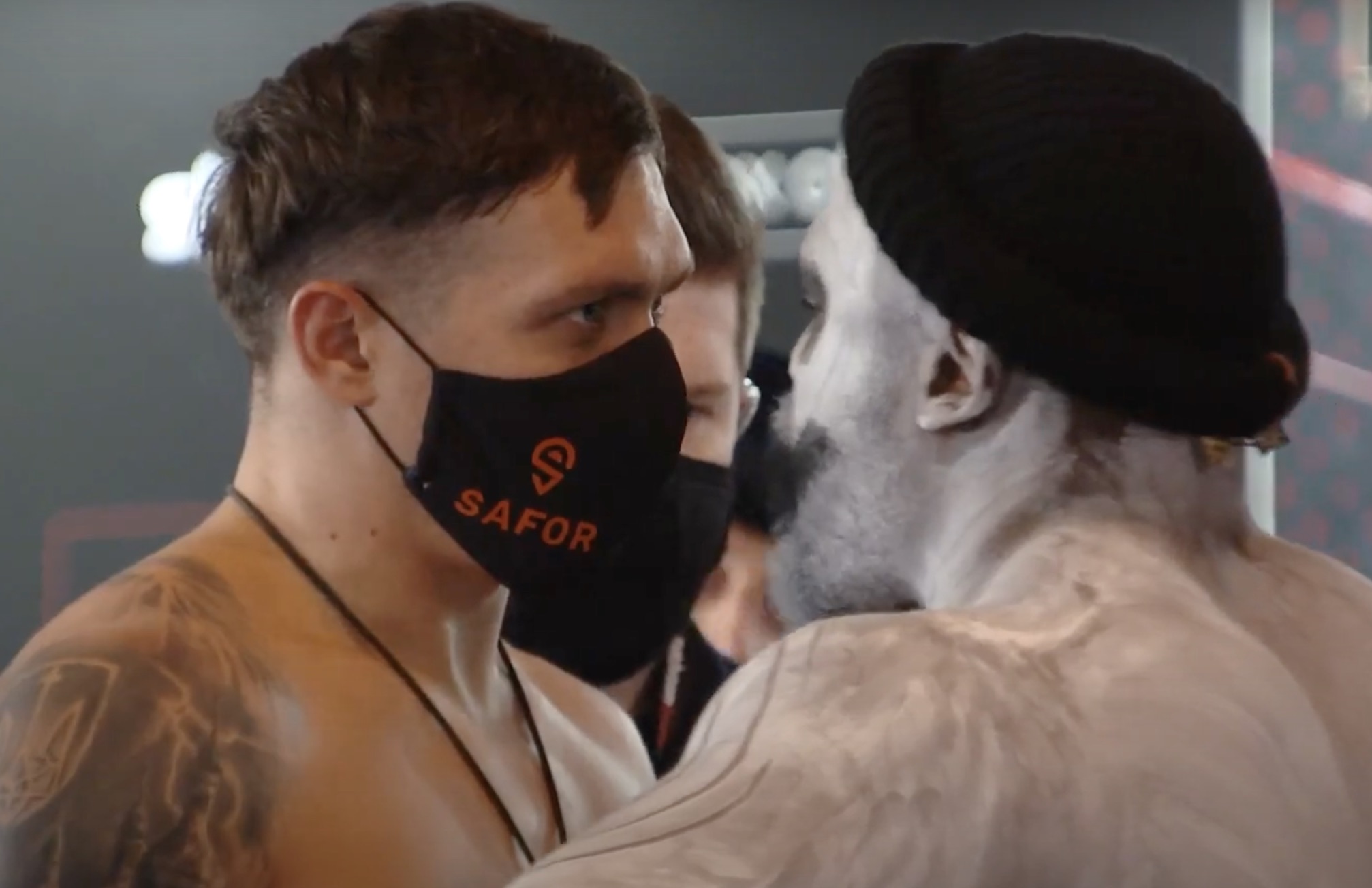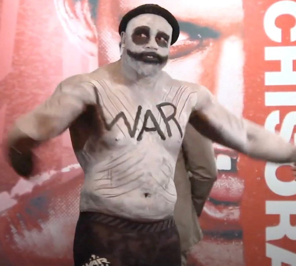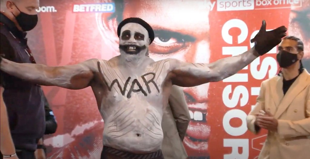 Domani è la notte di Halloween, tutto può accadere. Ce lo ha ricordato Dereck Chisora che si è presentato al peso con una pesante maschera. Uno strato di bianco latteo sulla faccia, nero carbone attorno agli occhi e alla bocca, WAR dipinto sul torace e in una spilla messa tra i denti. Ovviamente, unico personaggio in sala senza mascherina. Anche quando si è messo a un centimetro da Usyk per un faccia a faccia che sembrava interminabile. Chisora parlava, parlava. L’altro non faceva una piega.