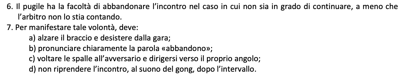 6. Il pugile ha la facoltà di abbandonare l’incontro nel caso in cui non sia in grado di continuare, a meno che l’arbitro non lo stia contando.