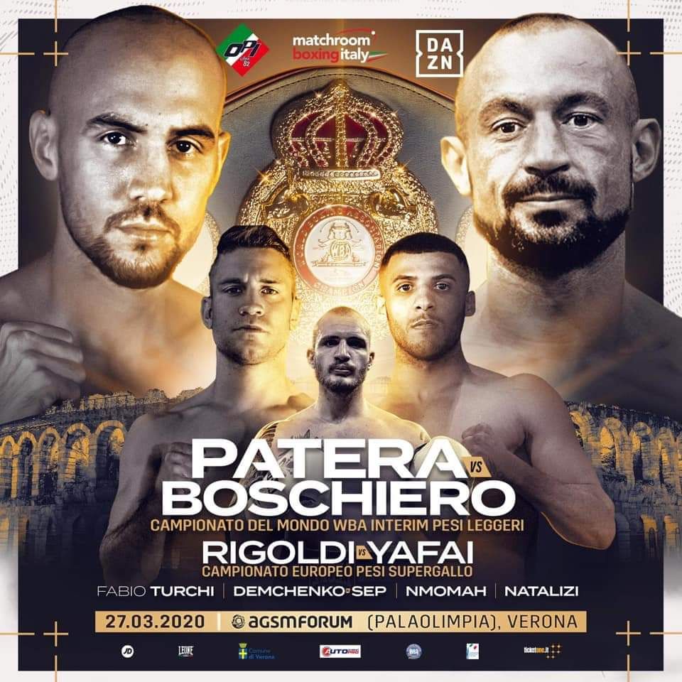 Leggeri (vacane Wbc Silver) Francesco Patera (23-3-0) vs Devis Boschiero (48-6-2); supergallo (europeo) Luca Rigoldi (22-1-2, detentore) vs Gamal Yafai (17-1-0); superpiuma (Mondiale IBF donne) Maiva Hamadouche (21-1-0) vs Nina Pavlovic (6-3-1); superwelter: Mirko Natalizi (8-0) vs Manuel Largacha (9-9-6); superleggeri (Sandor Martin (36-2-0) vs Nestor Maradiaga (8-9-1).