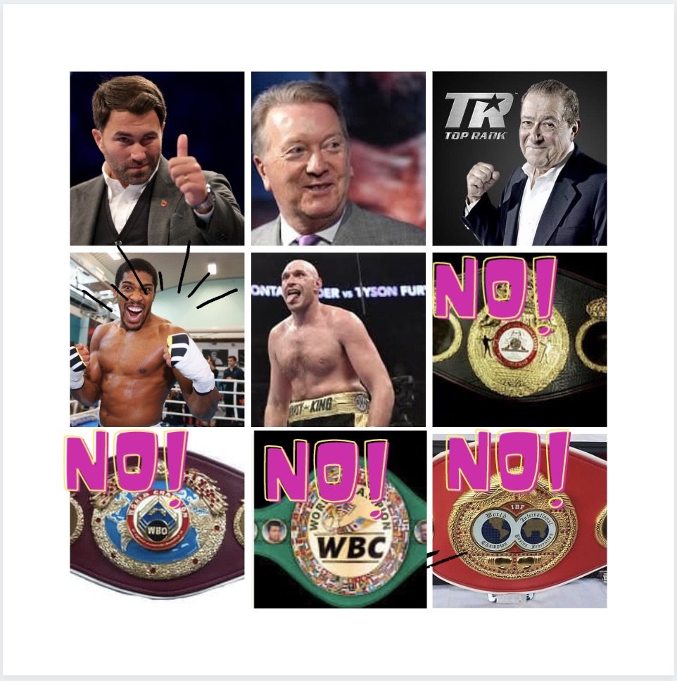 Credo sarebbe possibile. Pensate che il match tra Anthony Joshua e Tyson Fury avrebbe bisogno dell’appoggio di Wbc, Wba, Ibf o Wbo per avere successo, per vendere almeno due milioni di contatti in pay per view, per far parlare il mondo intero, che il trio Hearn/Arum/Warren non sia in grado di gestire in proprio lo spettacolo?