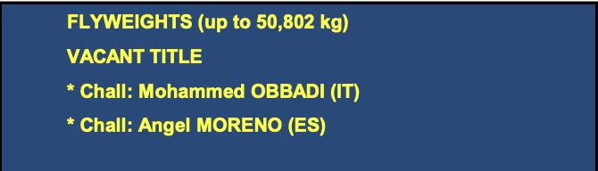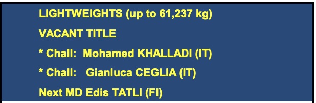 Vado alla situazione titoli (sempre sulla pagina dell’EBU) e scopro che, per magia, sono spariti sia Khalladi che Obbadi. Sembra che entrambi, da tempo residenti nel nostro Paese (il primo proveniente dalla Tunisia l’altro dl Marocco) per la legge non siano ancora italiani. I titoli sono sempre vacanti, ma hanno ciascuno un solo co-sfidante.