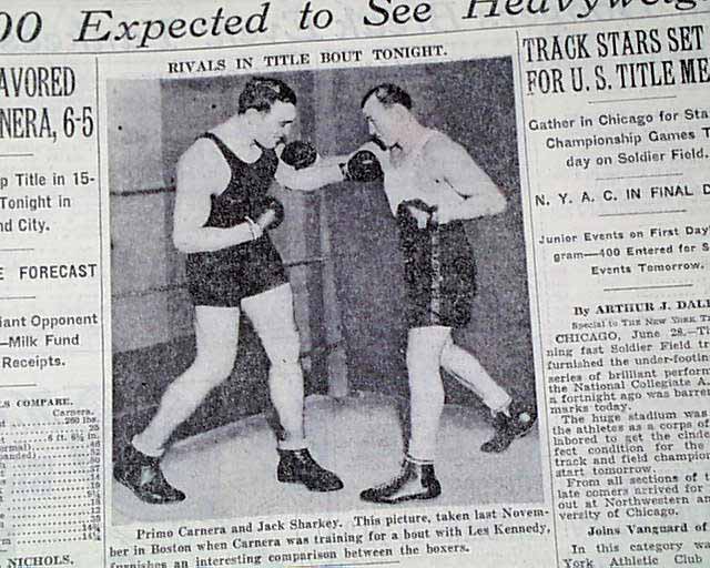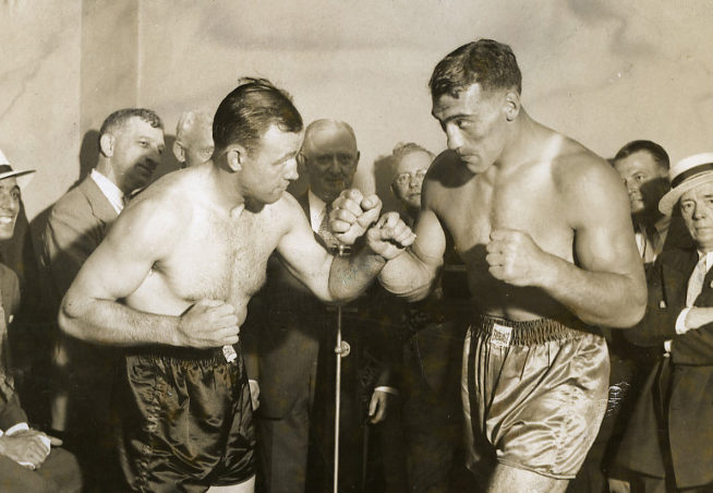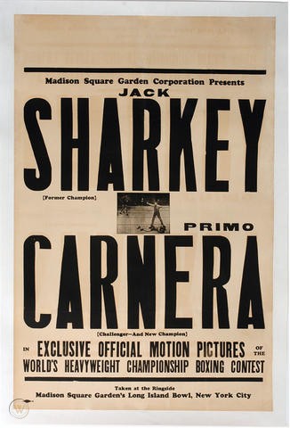 Madison Square Garden Bowl, arena all’aperto tra la 48th Street e Northern Boulevard, Long Island, New York. Dopo una mattinata scossa dai temporali è tornato il bel tempo. Alle 15 i ventimila posti popolari sono già pieni, il biglietto costa due dollari. Alle 18 gli spettatori sono sessantamila, alle 19 si sono riempite anche le sedie di bordo ring (prezzo iniziale 15 dollari, i bagarini li hanno a 90). Ci sono settantamila persone quando alle 21:41 del 29 giugno 1933 l’arbitro Artur Donovan dà il segnale di “boxe” al campione Jack Sharkey e allo sfidante Primo Carnera. In palio c’è il titolo mondiale dei pesi massimi. Il detentore è alto 1.83 e pesa 90,950 chili, lo sfidante arriva a 2.03 per un peso di 118,190.