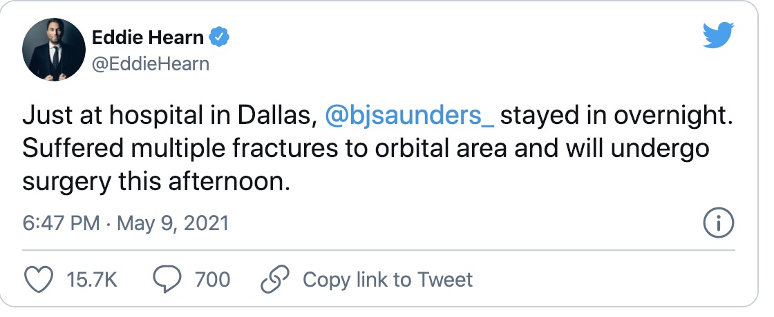 Saunders ha riportato fratture multiple alla cavità orbitale, non vedeva dall’occhio destro, è stato portato in ospedale per un’operazione che dovrebbe ridurre le fratture e consentirgli un recupero totale dell’occhio.