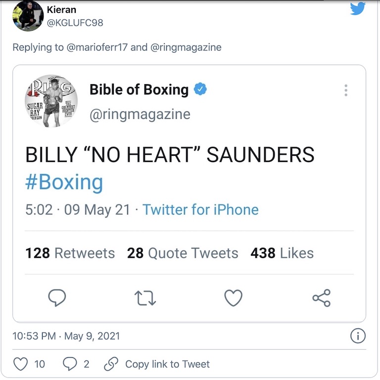 Usando il logo di The Ring, un personaggio che collabora con i social della famosa rivista, ha scritto un post su Twitter: “Billy “senzacuore” Saunders”. La direzione di The Ring si è scusata. Sullo stesso tono si sono accodati Edgar Berlanga e Fernando Vargas.