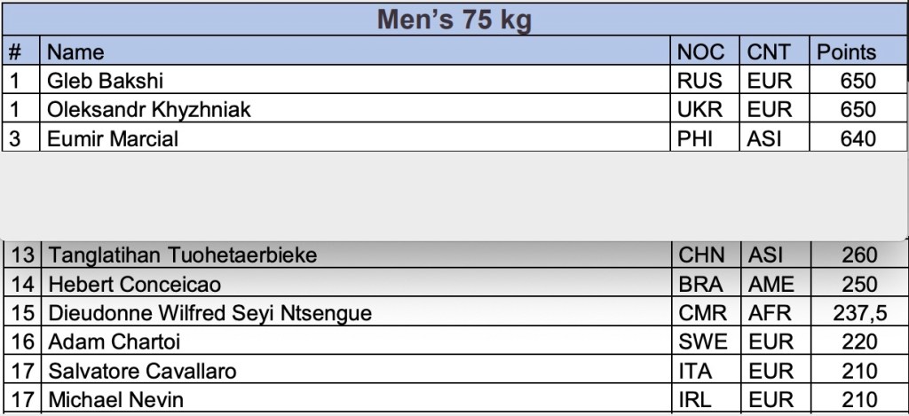 I 210 punti per sperare Cavallaro li aveva conquistati agli Europei di Minsk 2019, quattro vittorie (sconfitti anche Nevin e Charthoi) e medaglia d’argento, e ai Mondiali di Ekaterinbug dello stesso anno, dove aveva ottenuto due vittorie prima di essere eliminato.