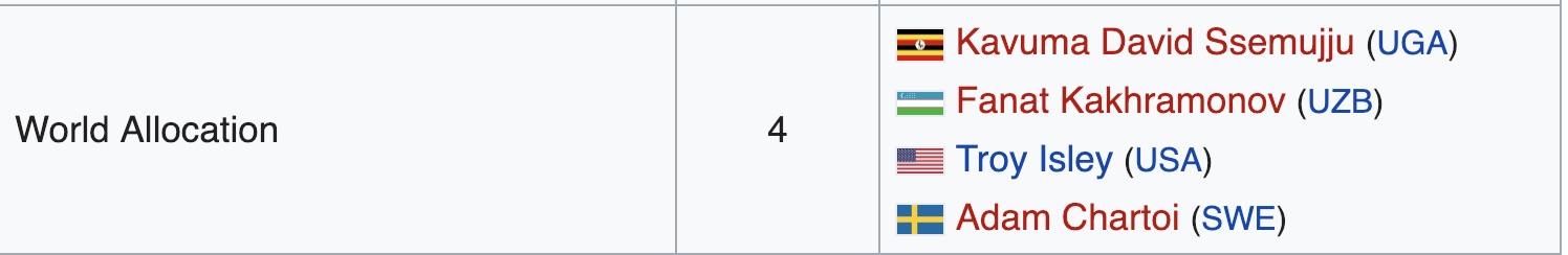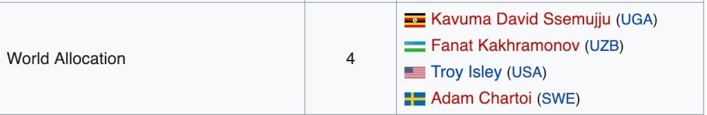 Nella categoria, come 25esimo iscritto, è stato inserito Eldric Sella Rodriguez che fa parte della EOR (équipe olumpique des réfugiés), la squadra dei rifugiati. VIene dal Venezuela, è scappato a Trinidad and Tobago dove è stato poi raggiunto dal papà, che è anche suo allenatore.