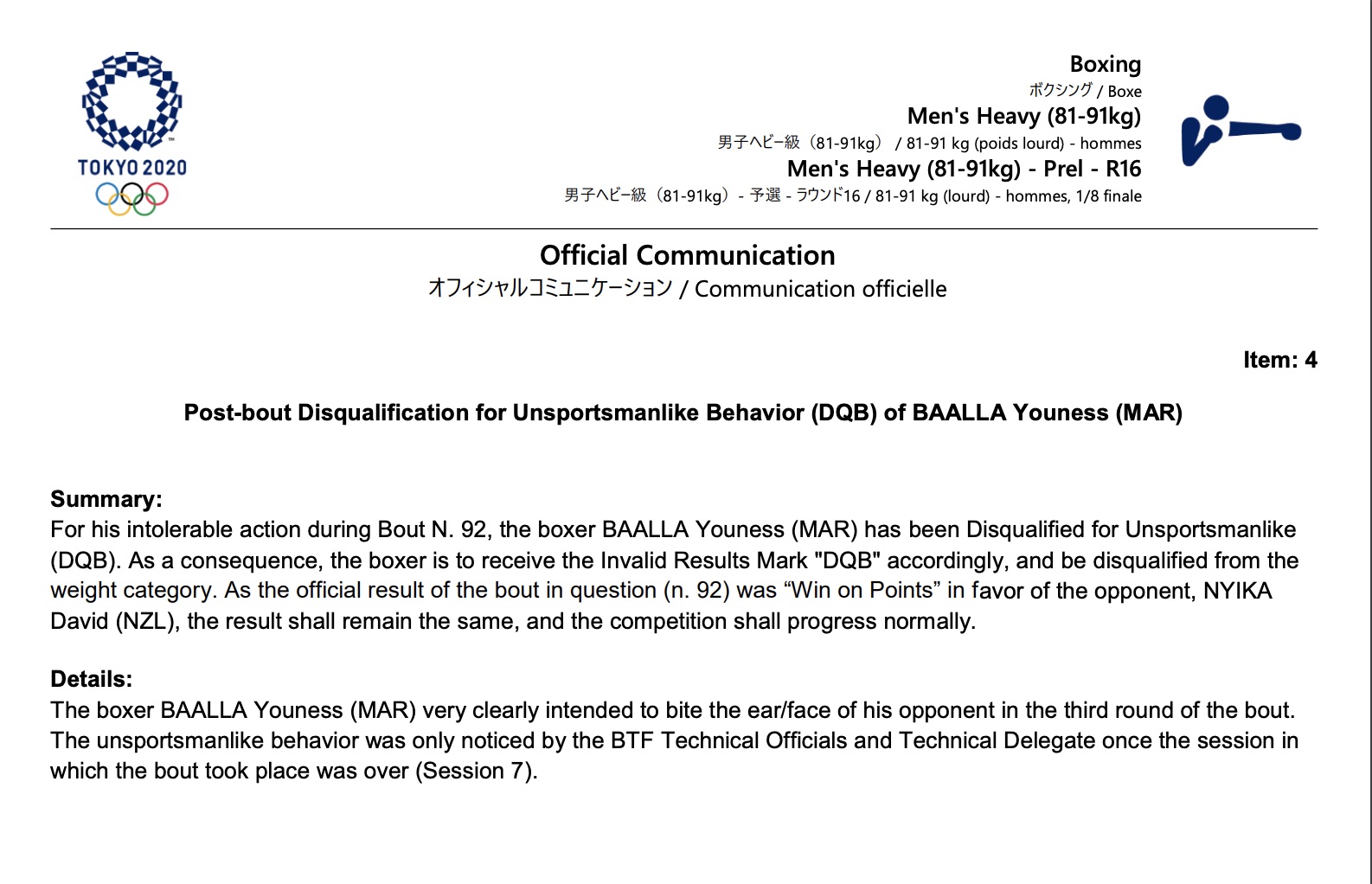 Che dire poi della signora Nelka Shiromala Thampu, dello Sri Lanka. Non si è accorta del tentativo del marocchino Youness Baalla di mordere lo zigomo di David Nyika, durante i sedicesimi del torneo dei pesi massimi. L’africano è stato squalificato solo a match concluso, con vittoria ai punti del neozelandese, dalla commissione della Boxing Task Force.