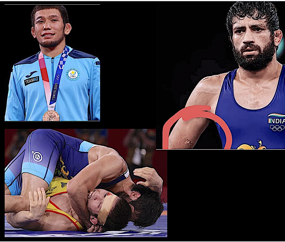 Il kazako morde Kumar al bicipite destro provocandogli una ferita, intervento del medico. Borsa di ghiaccio sul braccio infortunato. Nessun proveddimento disciplinare. Si riprende, l’indiano vince per atterramento e va in finale.