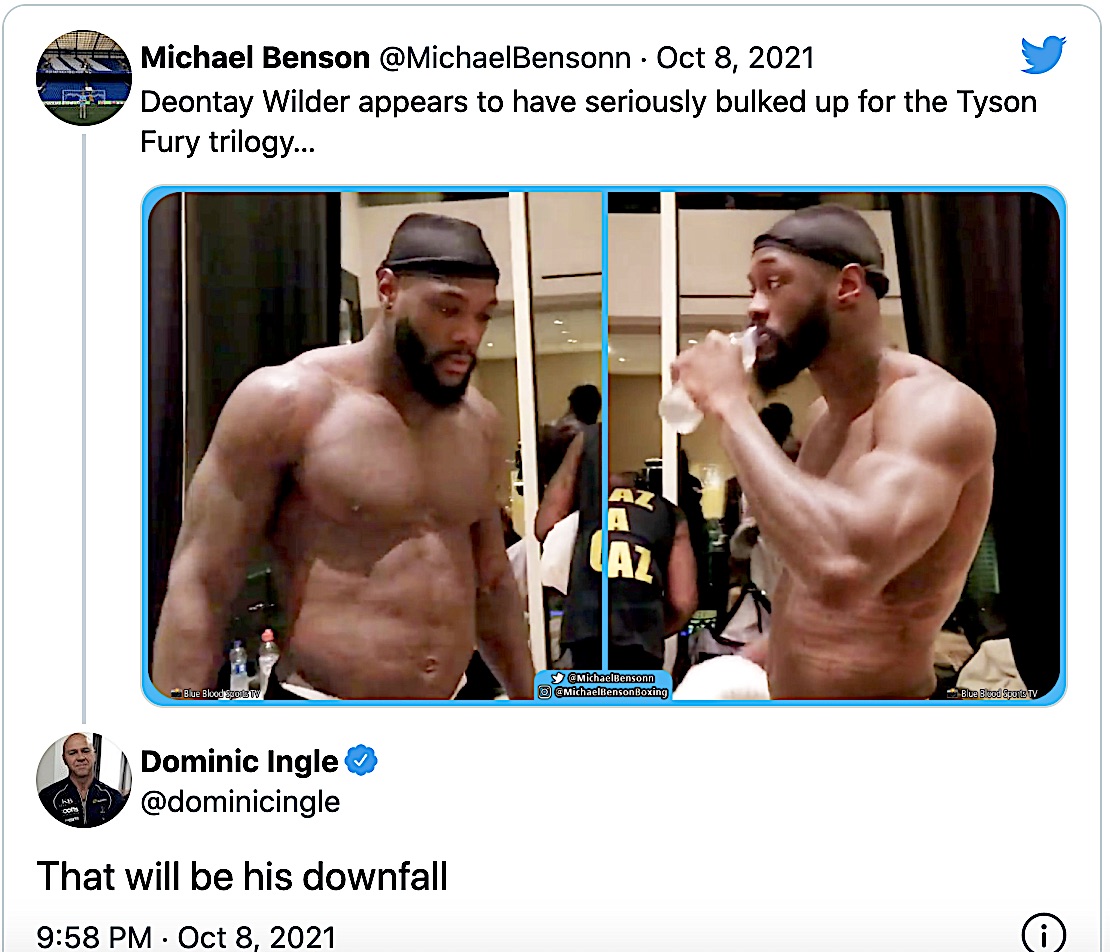 Ma chi ha impressionato alle operazione di peso ufficiali è stato Deontay Wilder, anche per lui peso record della carriera: 108! Decisamente fuori quadro rispetto a quanto aveva fatto vedere sinora. Una foto (sopra) postata da Michael Benson, direttore del giornale online TalkSport’s, sul suo profilo Twitter mostra uno Wilder decisamente appesantito, quasi non fosse nelle migliori condizioni fisiche.