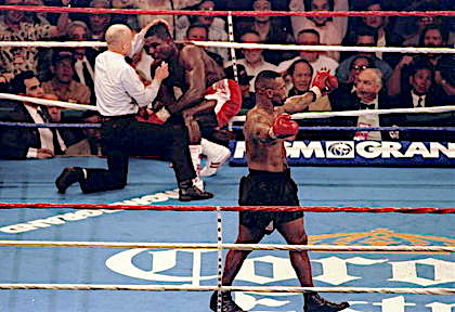 Iron Mike si inginocchia sul tappeto, sembra stia per mettersi a pregare.