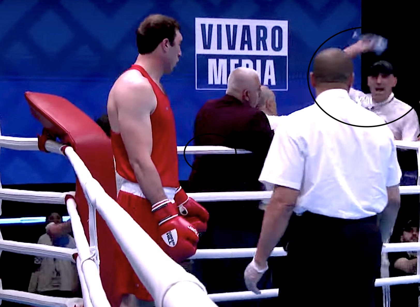 Proteste dall’angolo dello sconfitto. Uno dei secondi, sembrerebbe il vice allenatore, un tipo alto magro e con un cappellino calato sulla testa, salta sul ring. Il braccio protesto verso la faccia dell’arbitro, lo sfiora. Ancora proteste, qualcuno tira una bottiglia di plastica sul quadrato. Lo stesso tizio di prima la raccoglie e la lancia (foto in alto) contro il signor Lee Martin Innes che viene centrato in piena faccia. Altre bottiglie volano sul quadrato.