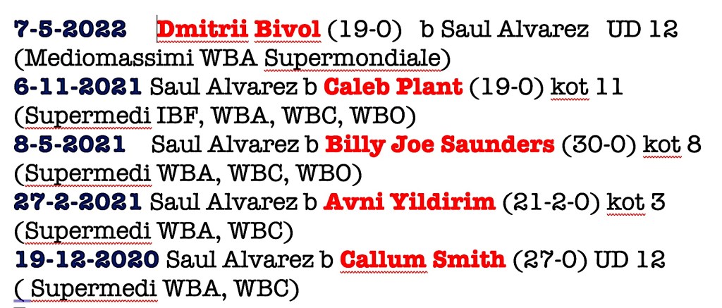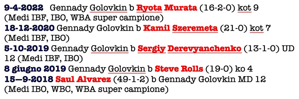 16-7-2017 (medi IBF, IBO, WBA, WBC ) Saul Alvarez (49-1-1) e Gennady Golovkin (37-0) D/SD 12 (Adelaide Byrd 118-110, Dave Moretti 113-115, Don Trella 114-114)