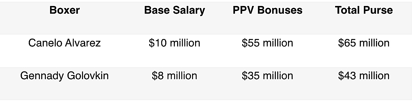 Il compenso dei due pugili è formato da una base fissa, a cui si aggiungerà la percentuale sulla vendita della pay per view (PPV). Sportszion.com ha ipotizzato l’entità della cifra finale, avendo come riferimento l’ultima sfida, in cui Canelo e GGG sono partiti rispettivamente da una base di 5 e 4 milioni di dollari, per arrivare con l’incasso della tv a una cifra oscillante tra i 35 e i 40 milioni di dollari. Quattro anni dopo le borse dovrebbero essere quelle riportate qui sotto.