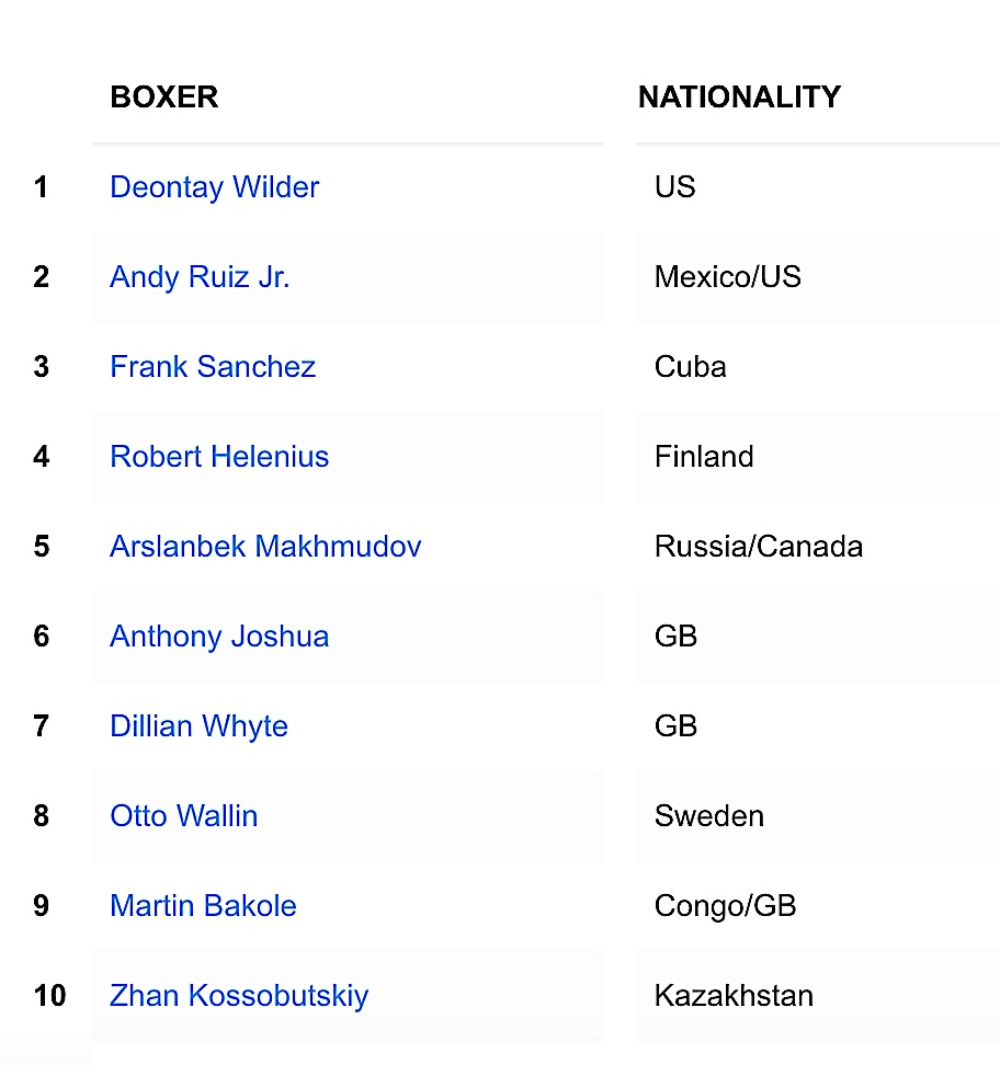 La base dovrebbe essere quella che ho illustrato in un altro articolo: il vincente di Deontay Wilder vs Robert Helenius contro Andy Ruiz. Il vincitore di Fury vs Joshua sarà poi obbligato ad affrontare chi avrà la meglio in quella sfida.