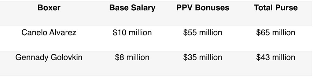 Il compenso dei due pugili è formato da una base fissa, a cui si aggiungerà la percentuale sulla vendita della pay per view (PPV). Sportszion.com ha ipotizzato l’entità della cifra finale, avendo come riferimento l’ultima sfida, in cui Canelo e GGG sono partiti rispettivamente da una base di 5 e 4 milioni di dollari, per arrivare con l’incasso della tv a una cifra oscillante tra i 35 e i 40 milioni di dollari. Quattro anni dopo le borse dovrebbero essere quelle riportate qui sotto.