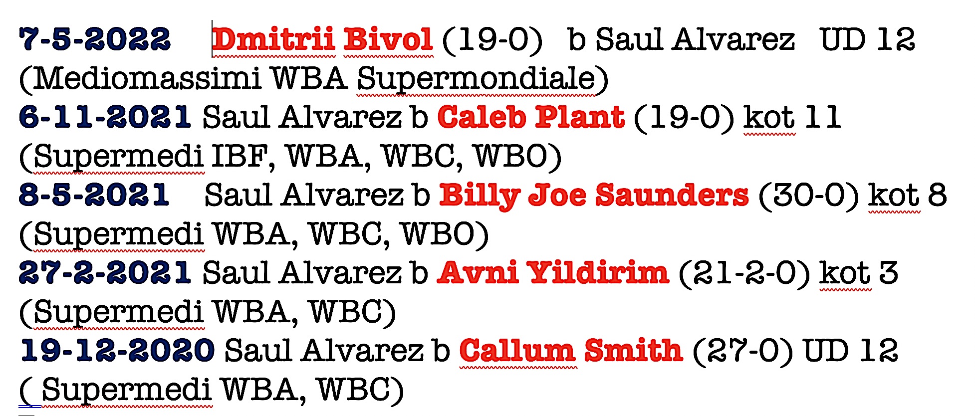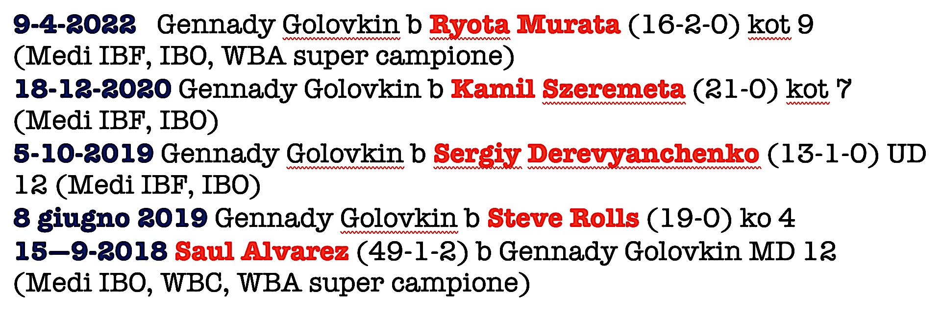 16-7-2017 (medi IBF, IBO, WBA, WBC ) Saul Alvarez (49-1-1) e Gennady Golovkin (37-0) D/SD 12 (Adelaide Byrd 118-110, Dave Moretti 113-115, Don Trella 114-114)