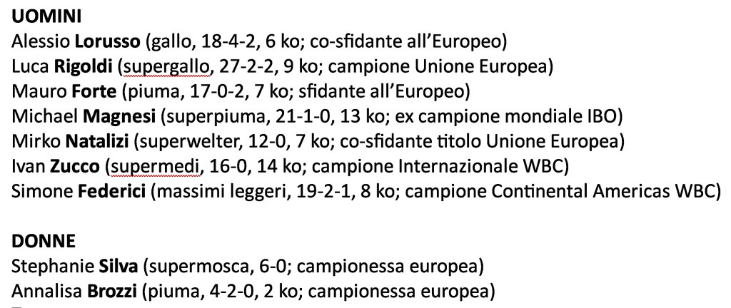 Una nota a parte per il Club Pro, nove professionisti (sette uomini e due donne) che saranno assistiti economicamente e sotto il profilo sanitario (a loro richiesta) dalla Federazione Pugilistica Italiana.