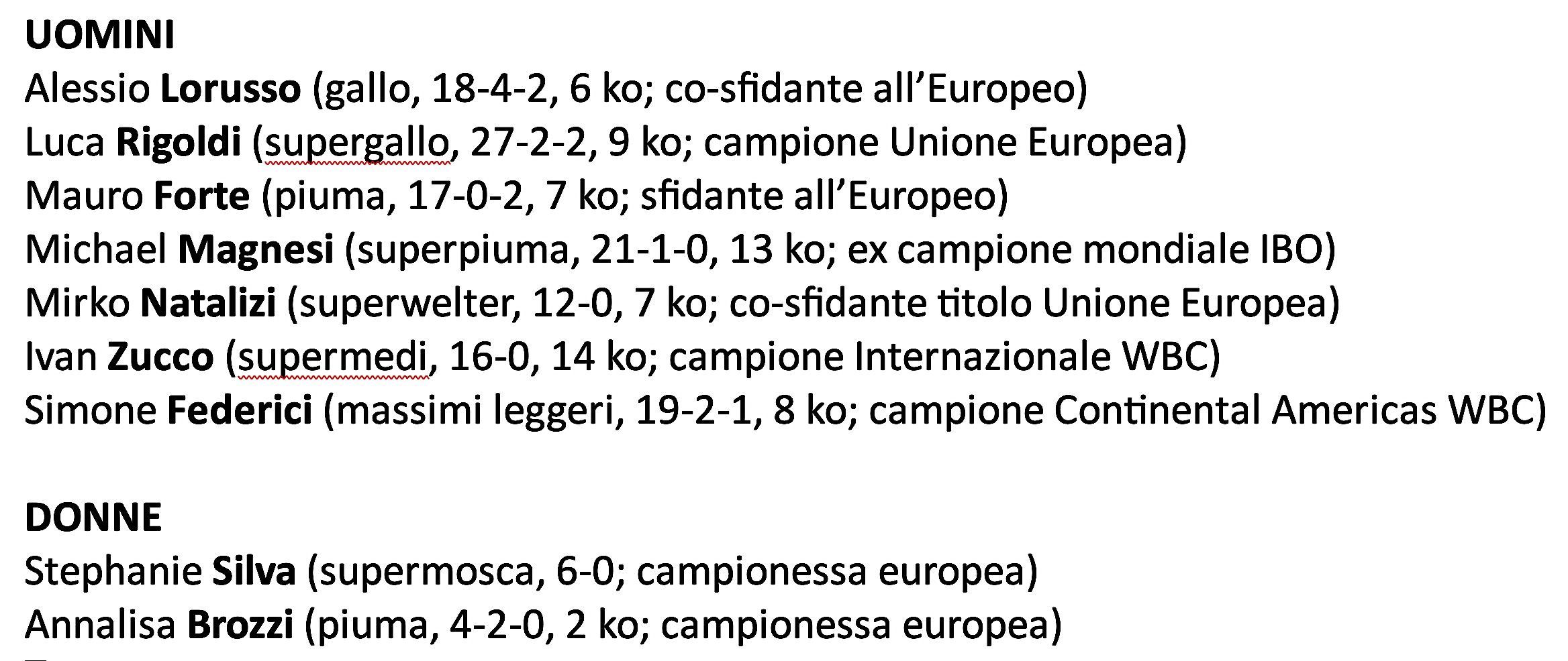 Dall’alto in basso: Alessio Lorusso, che domani si batte per l’europeo dei pesi gallo a Monza, contro lo spagnolo Sebastian Perez; Annalisa Brozzi, campionessa europea dei piuma; Luca Rigoldi, campione dell’Unione Europea nei supergallo; il giovane peso medio Giovanni Sarchioto; il ventenne Kevin Mustafaj; Stepanhie Silva, campionessa europea dei supermosca.