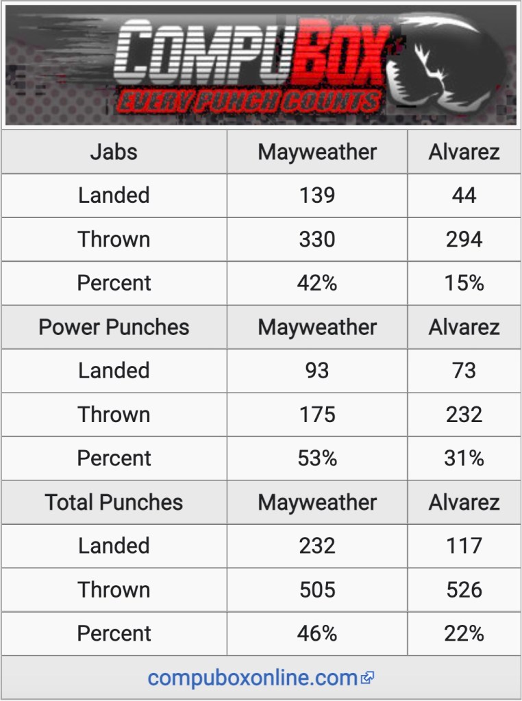 Mayweather domina e vince ai punti: 116-112, 117-111 i cartellini di due giudici, 114-114 il cartellino di C.J. Ross, la signora che per la vergogna lascia la boxe. L’Associated Press ha 119-109, Dan Rafael di ESPN ha 120-108. Entrambi i cartellini in favore di Mayweather. A fine match, Canelo (fonte boxrec) dichiara: “Non sapevo come prenderlo. È molto intelligente. Ha molta esperienza. Onestamente, non sono quasi mai riuscito a trovarlo. Negli ultimi round, mi sono sentito frustrato“.