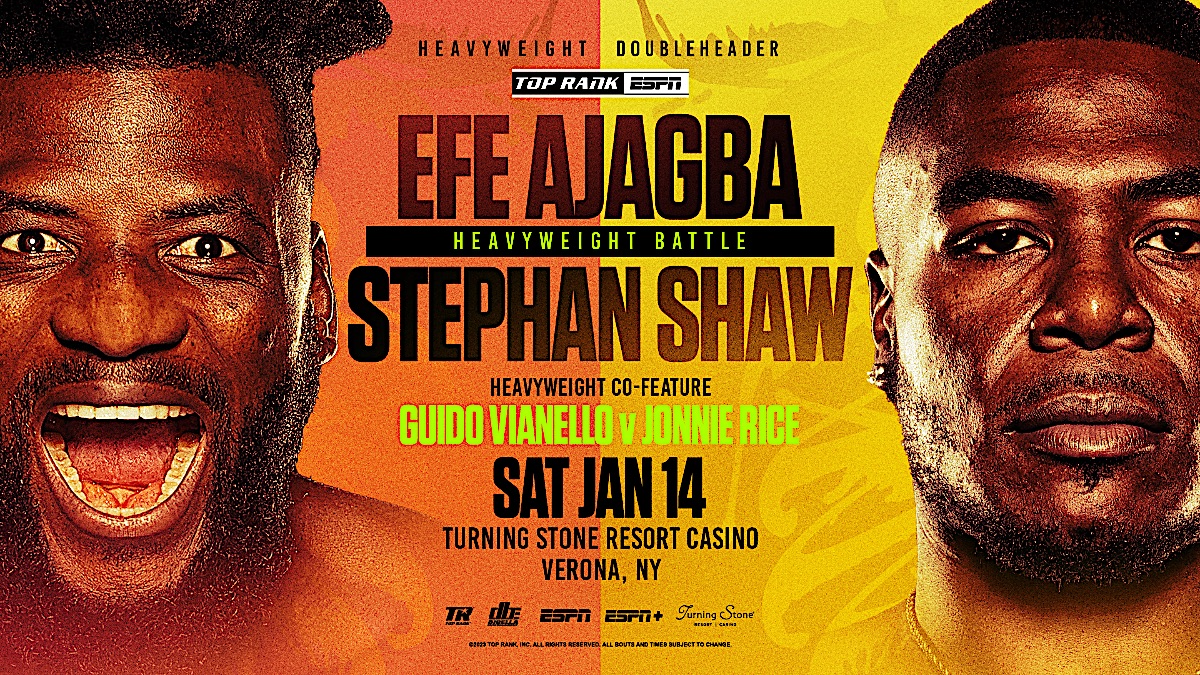 PROGRAMMA (Turning Stone Resort&Casino, Verona, New York) Massimi (10×3) Efe Ajagba (16-1-0, 13 ko, 106,700 kg) vs Stephen Shaw (18-0, 13 ko, 108,600); massimi (10×3) Guido Vianello (10-0-1, 9 ko, 108,400) vs Rice (15-6-1, 10 ko, 124,400); superpiuma (10×3) Adam Lopez (16-3-0) vs Abraham Nova (21-1-0); superpiuma (8×3) Heven Brady (8-0) vs Ruben Cervera (13-3-0).
