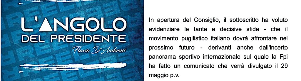 (In apertura di Consiglio, il sottoscritto ha voluto evidenziare le tante e decisivive sfide – che il movimento pugilistico italiano dovrà affrontare nel prossimo futuro – derivanti anche dall’incerto panorama sportivo internazionale sul quale la Fpi ha fatto un comunicato che verrà divulgato il 29 maggio p.v.)