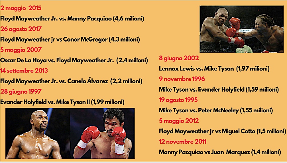 Floyd Mayweather, rappresenta l’eccezione nel campo della pay per view. Senza di lui bisogna tornare indietro di 20 anni e più, arrivare a Holyfield vs Tyson II (1997) o Lewis vs Tyson (2002) per trovare un evento che abbia sfiorato i due milioni.