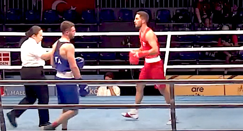 Nota a margine. Doppio affrettato (e uso un eufemismo) conteggio subito dall’azzurro. Ormai anche un colpo appena appoggiato merita la numerazione scandita: 1, 2, 3…
