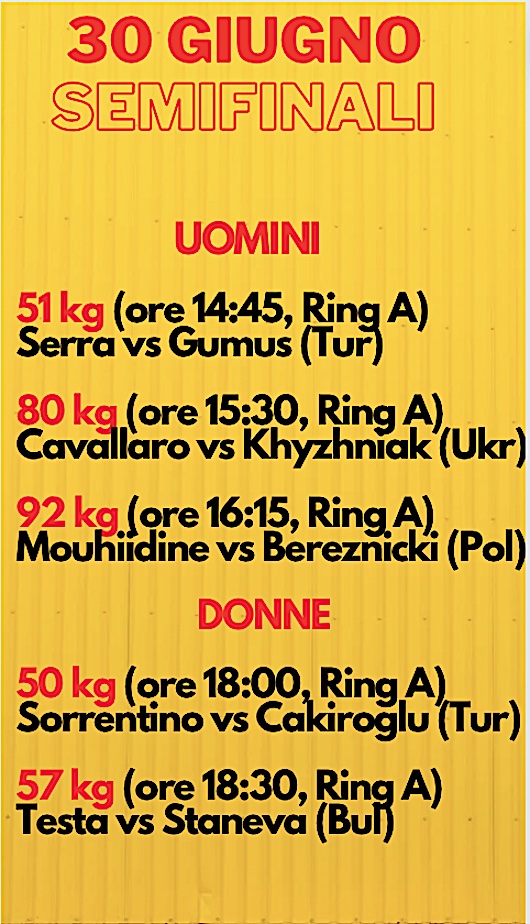 Domani, 30 giugno, le semifinali degli European Games. Per Federico Emilio Serra (51 kg) e Aziz Abbes Mouhiidine (92 kg) vincere significherebbe ottenere il pass per l’Olimpiade di Parigi 2024.