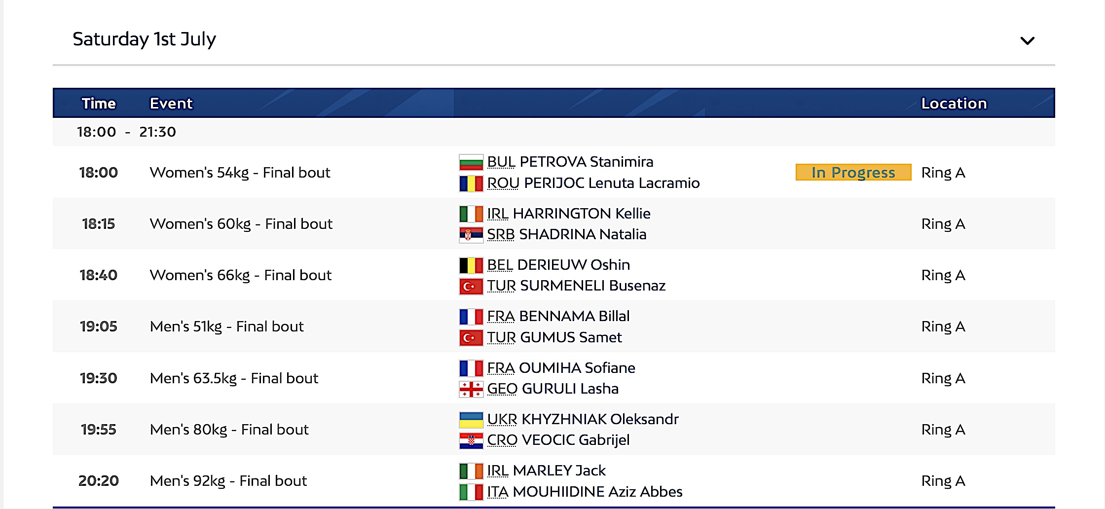 L’azzurro affronterà il 20enne irlandese Jack Marley alle 20:20, non alle 19:30 come precedentemente annunciato dal Comitato Organizzatore (cioè del Comitato Olimpico europeo).
