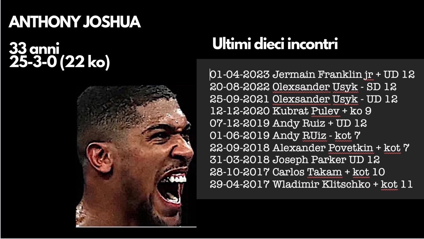 Anthony Joshua resta su piazza solo perché è ancora abbastanza popolare da riempire un’arena. E allora via, il prossimo 18 agosto, con Dillian Whyte. Un tipo che negli ultimi quattro match ha perso per ko 5 contro Alexander Povetkin. Lo ha sconfitto per kot 4 nella rivincita e dopo quell’incontro Povetkin ha annunciato il ritiro. È stato malmenato da Tyson Fury che lo ha messo kot al sesto round. Ha superato con verdetto a maggioranza (115-115, poi due generosi 116-112, 116-112) Jermaine Franklin. Lo stesso pugile che uno stanco, non convincente e in fase calante Joshua ha dominato in 12 round.